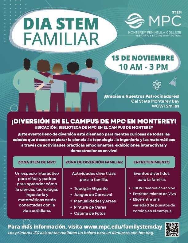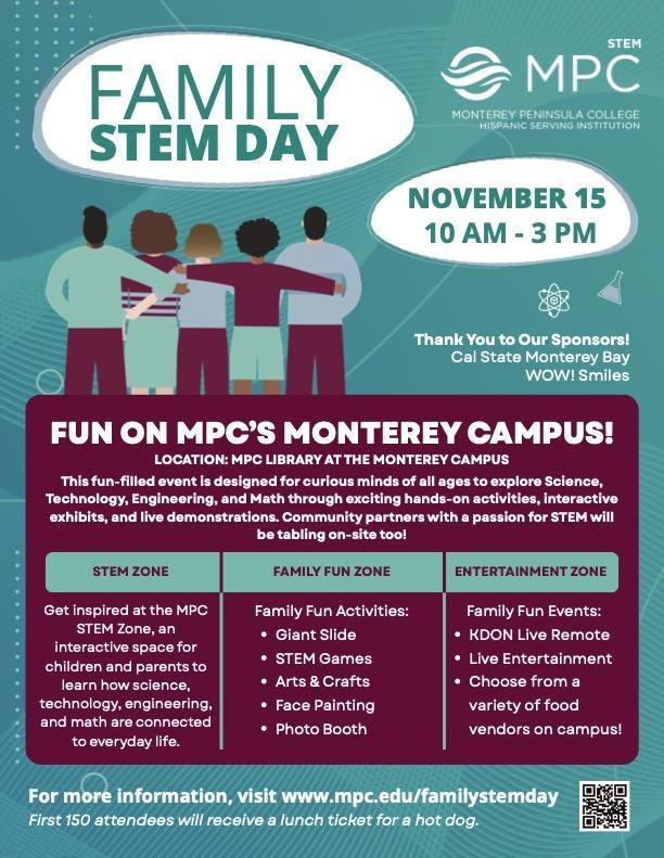 MPUSD is partnering with Monterey Peninsula College (MPC) to offer Saturday Academy credit for students who attend Family STEM Day on Saturday, November 15, from 10 a.m. – 3 p.m. at MPC’s Monterey Campus Library.