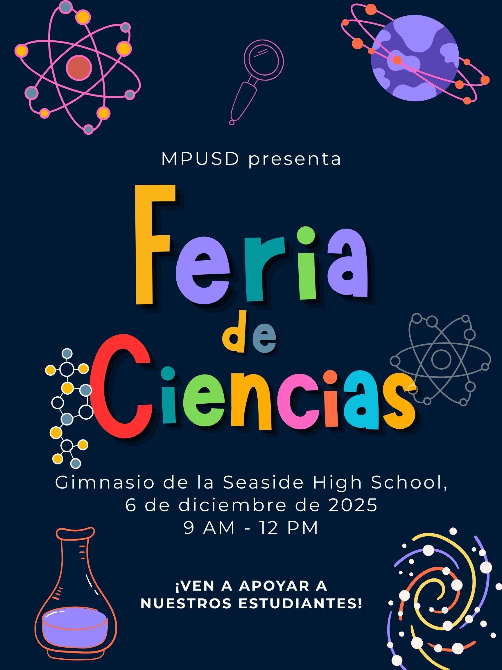 Join us for the MPUSD Districtwide Science Fair on Friday, December 6, 2025, from 9:00 AM - 12:00 PM in the Seaside High School gymnasium, located at 2200 Noche Buena in Seaside.